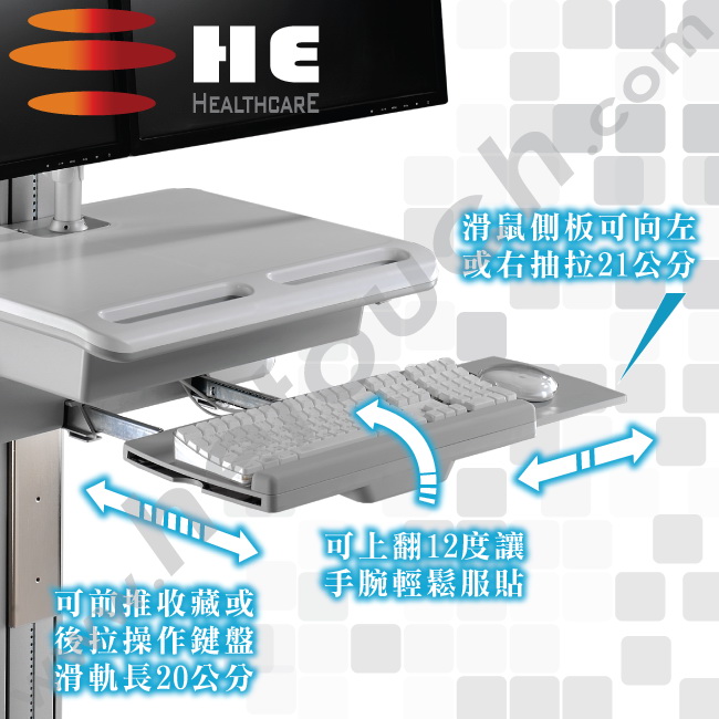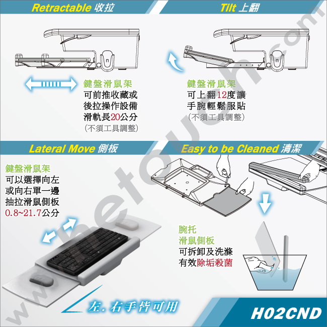 鍵盤滑鼠托架附滑軌(長200mm)可前推收藏或後拉操作鍵盤、滑鼠;並有腕托搭配可上翻12度的功能,讓手腕服貼輕鬆操作;可選擇向左或向右單一方向抽拉滑鼠側板,並可隨意伸縮至合適的寬度(8~217mm),貼心的設計讓慣用左手或右手的使用者皆可無障礙操作。