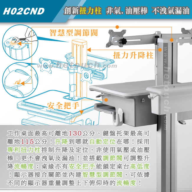 專利扭力柱搭載智慧型調節閥,可依據桌台的總載重量來調節扭力大小,載重轉緊、載輕放鬆(僅須調節一次),用以控制升降的流暢度,優點為桌台在高低升降時,不須任何工具或螺絲,僅需向上扳壓桌緣的安全把手即可調整高低度,範圍達50公分,升降到哪就自動定位在哪,隨調整即定位;鬆開安全把手後即能鎖定桌台高低,讓桌台穩如泰山、不會疲乏下垂。