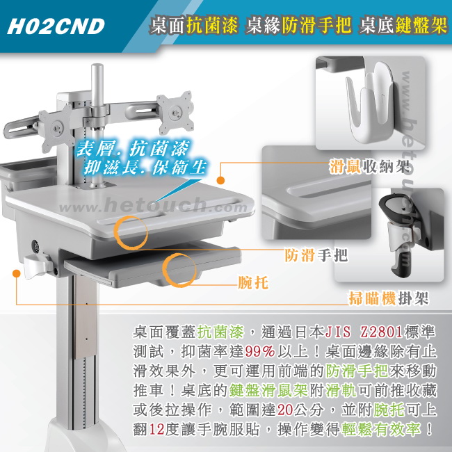 桌面覆蓋具有抑菌滋長的抗菌漆,經SGS以日本工業標準JIS Z2801方式檢驗,針對金黃色葡萄球菌、大腸桿菌測試,抑菌率達99%以上,可確保醫療護理環境的衛生。