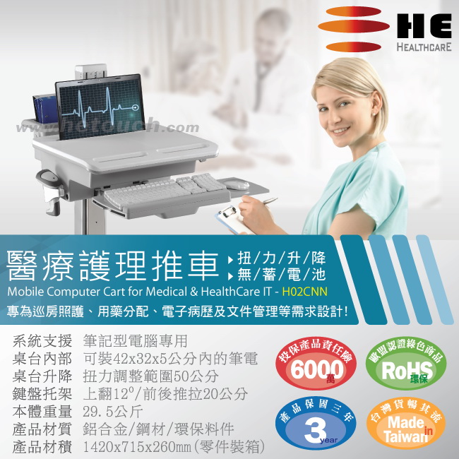 全機塗料與零件經檢驗皆通過歐盟RoHS危害性物質限制令的規範,稱之為長青、綠化料件,在此HE除了推薦您購買我們的醫療護理車,也推薦您購買真正的綠化產品。