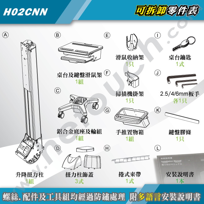 螺絲、配件及工具組均經過鍍鎳或防鏽處理,通過歐盟RoHS環保規範檢驗,請您安心使用!